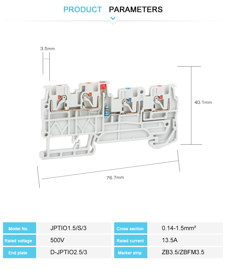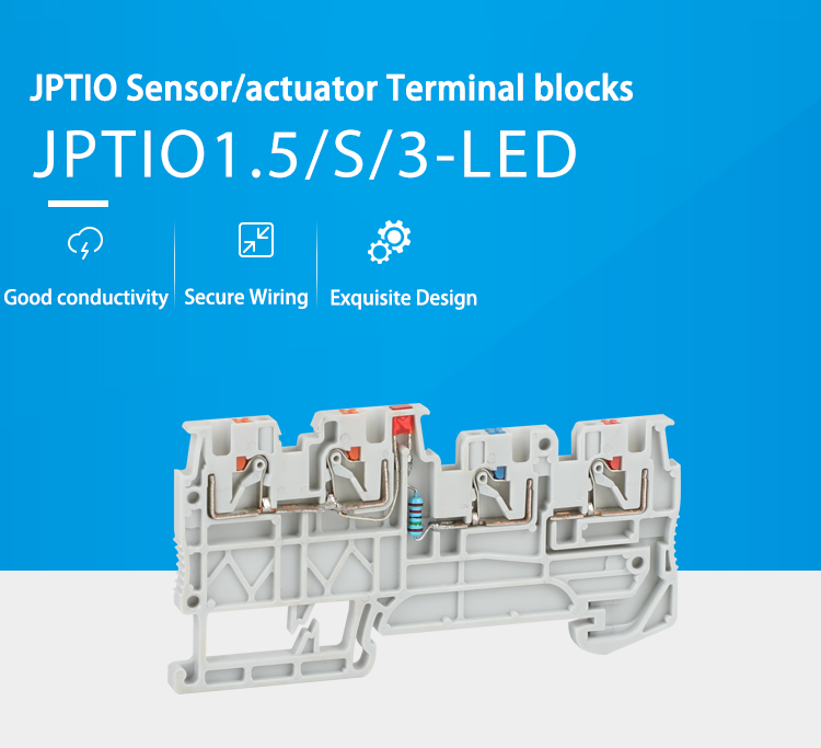 JPTIO1.5/S/3-LED(24V) aansluitblok Het aansluitblok maakt gebruik van vlamvertragend nylon PA66, messing geleider en roestvrijstalen drukveer om de elektrische veiligheid en mechanische sterkte onder zware werkomstandigheden te garanderen.